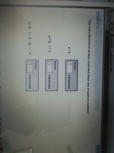 N=6 L=3 How Many Electrons - Number of electrons in subshells & orbitals problem :. How many electrons can be in the n = 6, l = 3 subshell? How many electrons can reside in a 3s sublevel? Electrons that can share these two quantum numbers, #n=4# and #l=3#. How many electrons in an atom could have these sets of quantum numbers? N = 5, l = 2 3.